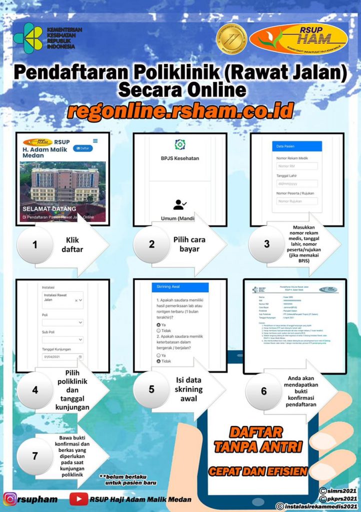 Pendaftaran Online Rawat Jalan dapat dilakukan menggunakan aplikasi android dan website. Cara penggunaannya dapat diikuti pada gambar dibawah ini: